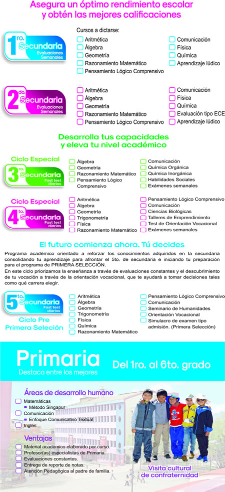 ¡Vive tus mejores vacaciones! INICIO LUNES 07 DE ENERO Te ofrecemos: Ciclado de Matemáticas, Comunicación, Ciencia y Tecnología Para alumnos de 1ro al 5to de...